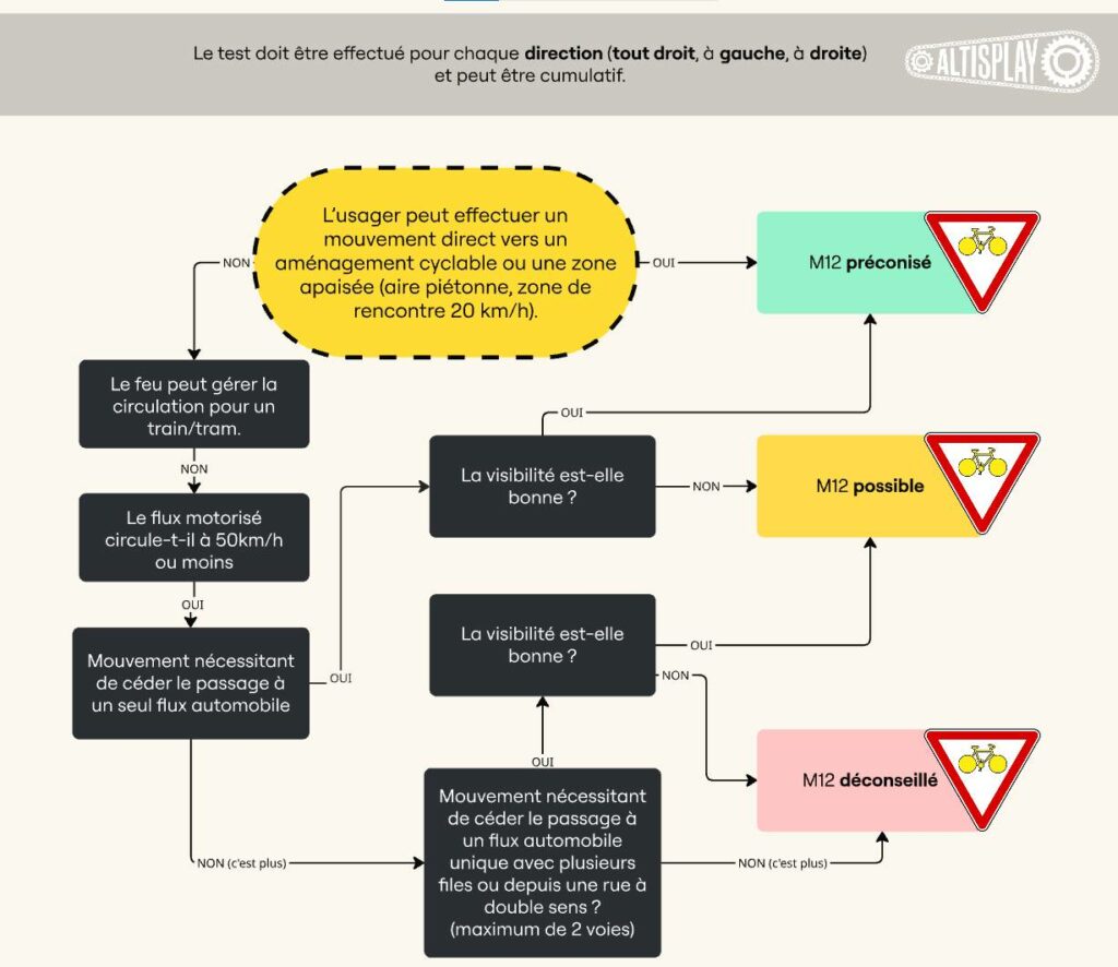 - Première étape : décider d’une direction et se demander si l’usage cycliste (ou EDP) peut faire un mouvement direct vers un aménagement où il sera en sécurité (aménagement cyclable, zone piétonne, zone de rencontre). Si c’est le cas, alors un panonceau M12 est possible.