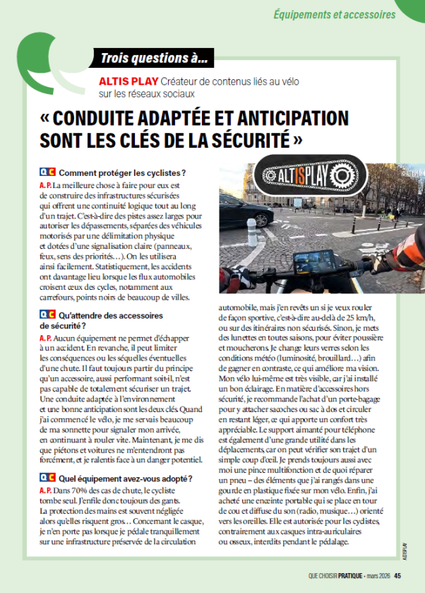 Dans un article publié dans Que Choisir Pratique (mars 2025), Altis Play rappelle que la sécurité à vélo repose avant tout sur l’anticipation et des infrastructures adaptées. Il insiste sur le rôle essentiel de pistes cyclables sécurisées et continues, tout en soulignant que les équipements (casque, éclairage, accessoires) ne remplacent pas la vigilance, mais permettent d’en limiter les conséquences. Une conduite attentive et adaptée reste, selon lui, la clé pour circuler en toute sécurité.